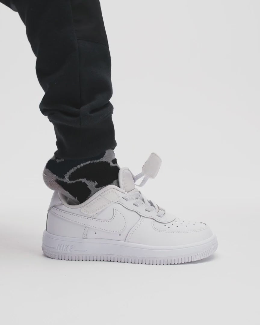 Il look dei lacci senza la fatica di doverli allacciare? Ora è tutto più facile. I lacci di queste sneakers sono solo per scena: i due passanti superiori per i lacci sono attaccati a una fascetta a strappo per aiutare i bambini a stringerli in un attimo senza rinunciare al tradizionale look di AF1. Ma queste scarpe non sono solo facili da indossare. Le abbiamo progettate per i piedi dei bambini anche per quanto riguarda il comfort.